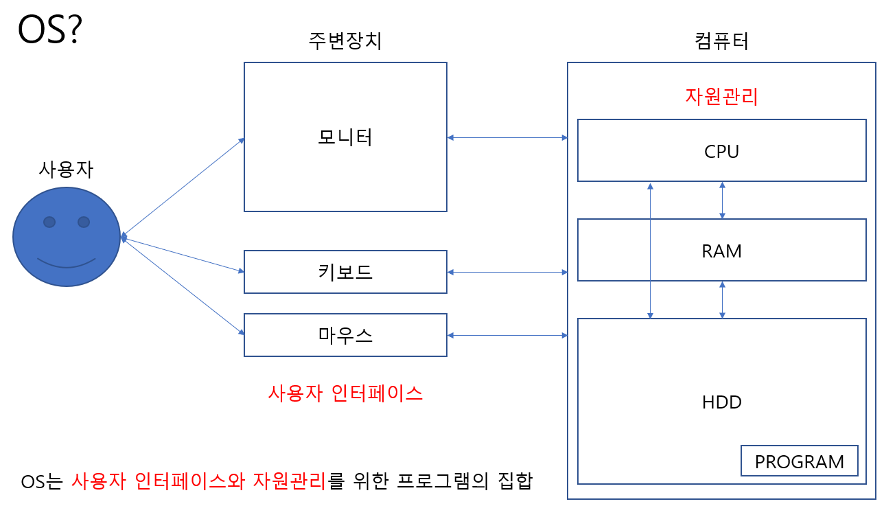 OS를 한마디로 표현하면 사용자 인터페이스와 자원관리를 위한 프로그램의 집합이라고 할 수 있습니다. 사용자 인터페이스는 사용자가 윈도우에서 아이콘이나 메뉴 버튼을 클릭하여 프로그램을 실행시키거나 파일을 여는 등의 일을 할 수 있도록 해주는 것이라고 할 수 있습니다. 자원관리는 컴퓨터의 자원(장치, 파일, 메모리, CPU 등)들을 효율적으로 관리하는 것 입니다. 이런 각각의 역할을 수행하는 프로그램들의 집합을 운영체제(OS)라고 합니다.
