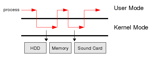 컴퓨터에는 여러 프로그램들이 있습니다. 운영체제에 속하는 프로그램, 응용 프로그램, 게임 프로그램 등... 이런 프로그램들이 실행될 때 두 가지 모드(커널모드, 유저모드)로 구분되어 실행됩니다. 이렇게 두 가지 모드로 구분하여 프로그램이 실행되도록 하는 이유는 아무 프로그램이나 컴퓨터의 자원을 직접 조작하게 된다면 컴퓨터에 치명적인 문제를 일으킬 수 있기 때문에 시스템에서 허가된 프로그램만이 자원에 접근할 수 있도록 하기 위해서입니다. 일반적으로 사용자 프로그램, 응용 프로그램은 유저모드에서 실행되고, 커널 프로그램이 커널모드에서 실행됩니다. 커널모드, 유저모드는 각각 독립적으로 실행되는 것이 아니고, 둘 중 하나의 모드로 시스템이 동작하는 것 입니다. 응용 프로그램을 실행되는 중에는 유저모드인 것이고, 커널 프로그램이 실행되는 중에는 커널모드가 되는 것 입니다. 커널모드 <-> 유저모드 변환은 mode bit 값으로 구분합니다. (커널모드 : 0, 유저모드 : 1)