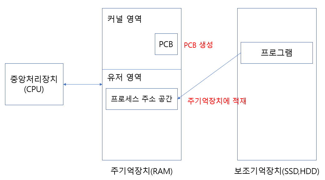 여기서 조금 더 자세히 말하면 프로세스는 주기억장치(RAM)에 적재되어 커널 영역에 PCB(프로세스 제어 블록)을 부여받은 프로그램이라고 할 수 있습니다.
